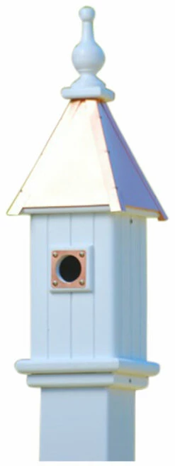 Classic design features one compartment with copper predator guard. Post-mounted birdhouse is crafted with utmost precision, made of cellular expanded PVC board, it’s guaranteed to last a lifetime with little to no maintenance.